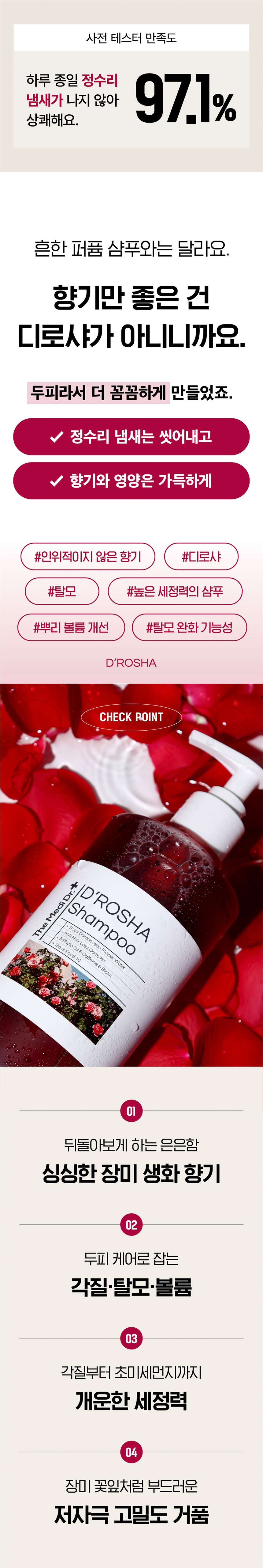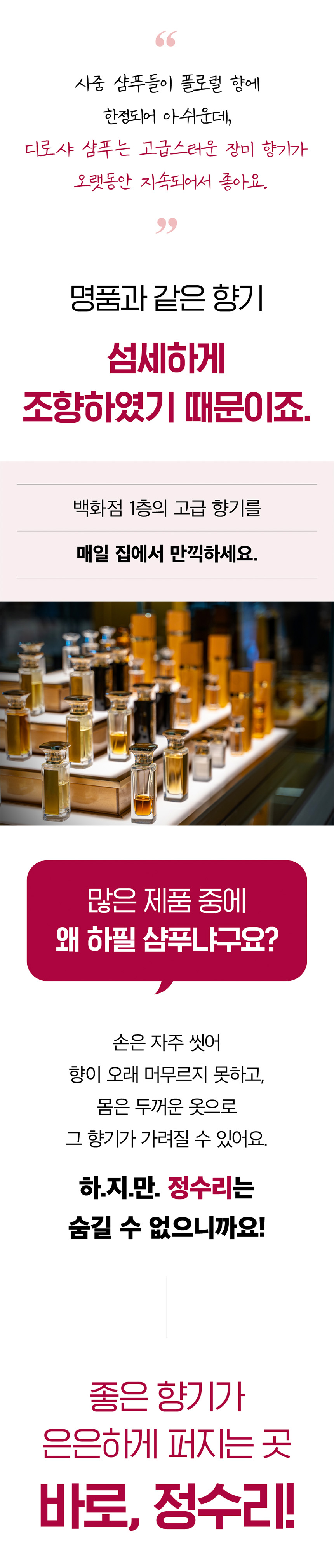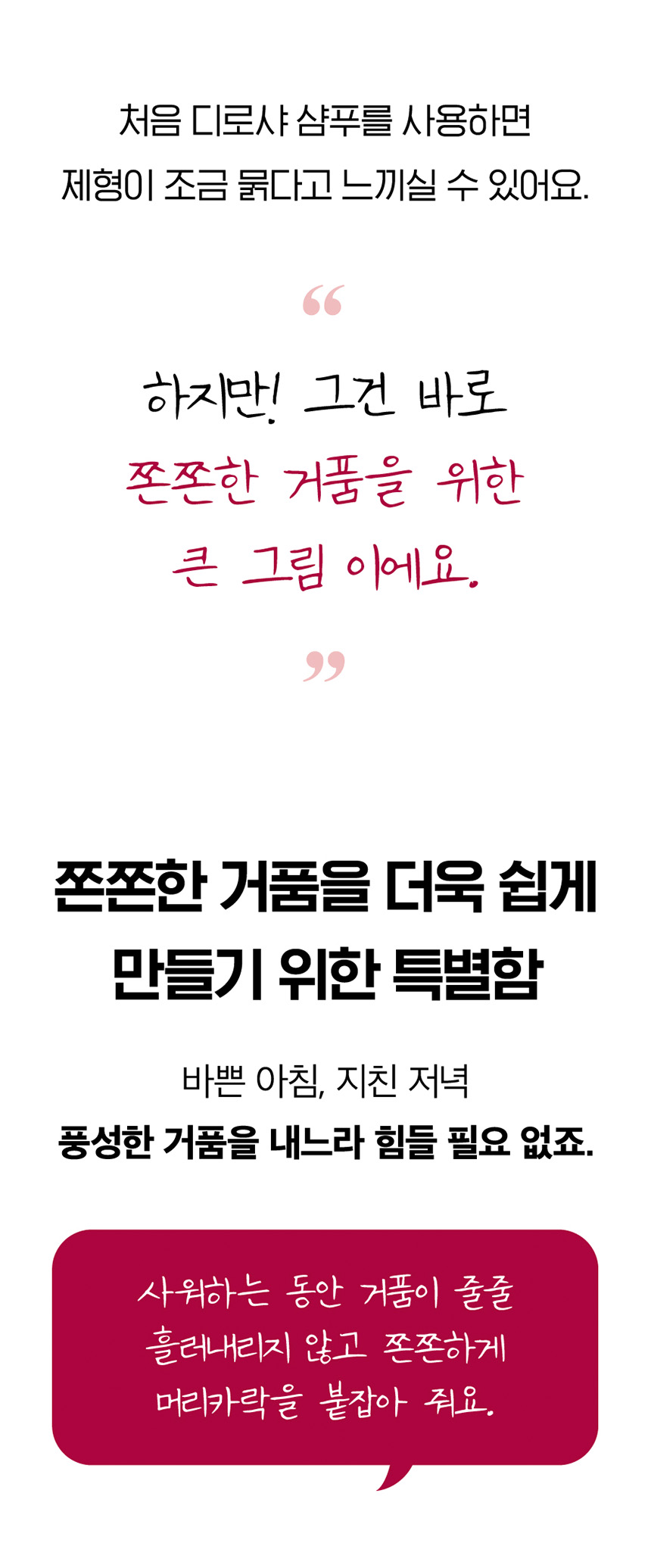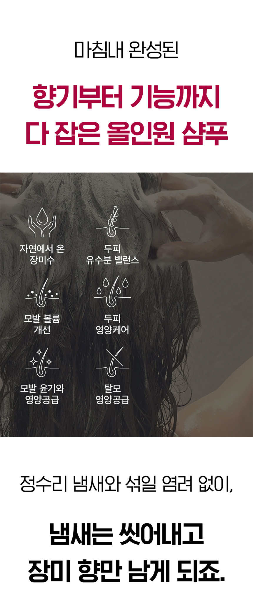 | 사용 중 주의사항 | 1. 화장품 사용 시 또는 사용 후 직사광선에 의하여 사용부위가 붉은 반점, 부어오름 또는 가려움증 등의 이상 증상 이나 부작용이 있는 경우에는 전문의 등과 상담할 것 2. 상처가 있는 부위 등에는 사용을 자제할 것 3. 보관 및 취급시의 주의사항 가. 어린이의 손이 닿지 않는 곳에 보관할 것 나. 직사광선을 피해서 보관할 것 4. 모발용 샴푸 가) 눈에 들어갔을 때에는 즉시 씻어낼 것 나) 사용 후 물로 씻어내지 않으면 탈모 또는 탈색의 원인이 될 수 있으므로 주의할 것 |