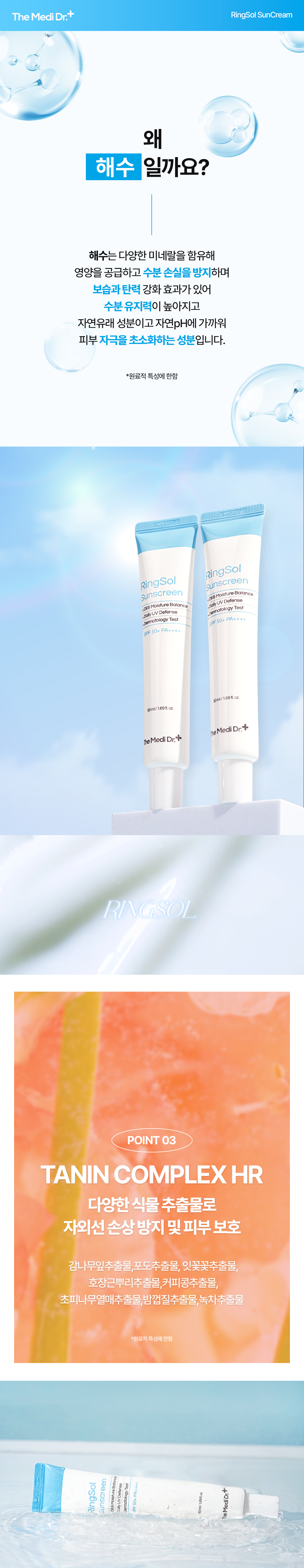 | 성분 | 해수, C12-15알킬벤조에이트, 폴리메틸실세스퀴옥세인, 프로판다이올, 에칠헥실살리실레이트, 호모살레이트, 사이클로펜타실록세인, 정제수, 메칠렌비스-벤조트리아졸릴테트라메칠부틸페놀, 폴리실리콘-15, 나이아신아마이드, 비스-에칠헥실옥시페놀메톡시페닐트리아진, 글리세린, 디에칠아미노하이드록시벤조일헥실벤조에이트, 폴리솔베이트60, 부틸렌글라이콜, 다이프로필렌글라이콜, 데실글루코사이드, 하이드록시아세토페논, 아크릴레이트/C10-30알킬아크릴레이트크로스폴리머, 트로메타민, 소듐아크릴레이트/소듐아크릴로일다이메틸타우레이트코폴리머, 카프릴릴글라이콜, 아이소헥사데칸, 다이소듐이디티에이, 티트리잎오일, 아데노신, 폴리솔베이트80, 프로필렌글라이콜, 잔탄검, 솔비탄올리에이트, 마그네슘아스코빌포스페이트, 다이포타슘글리시리제이트, 티트리잎수, 알로에베라잎추출물, 참마뿌리추출물, 다시마추출물, 제비꽃꽃추출물, 당느릅나무뿌리추출물, 감나무잎추출물, 포도추출물, 커피콩추출물, 호장근뿌리추출물, 잇꽃꽃추출물, 밤껍질추출물, 초피나무열매추출물, 녹차추출물, 약모밀추출물, 1,2-헥산다이올, 흰버드나무껍질추출물, 펜틸렌글라이콜, 에틸헥실글리세린 |